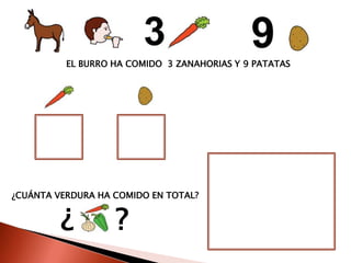 El documento presenta varios problemas aritméticos sencillos sobre la cantidad de verduras, huevos y animales en una granja, así como el material comprado por el granjero y la cantidad total de insectos. Se piden las sumas de las cantidades dadas en cada problema.