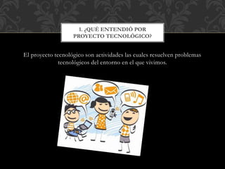 El documento habla sobre los proyectos tecnológicos y sus etapas. Explica que un proyecto tecnológico busca resolver problemas tecnológicos del entorno a través de actividades. Luego describe las cinco etapas clave de un proyecto tecnológico: 1) identificación del problema, 2) diseño de la solución, 3) organización y gestión, 4) programación y ejecución, y 5) evaluación y perfeccionamiento.