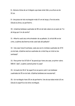 Este documento presenta 15 problemas matemáticicos relacionados con temas como geometría, álgebra y cálculo. Los problemas involucran calcular cantidades desconocidas como edades, número de objetos, áreas, perímetros y costos basados en información dada sobre dimensiones, precios y otras variables.