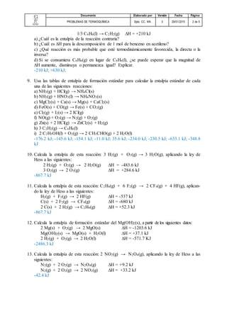 Este documento presenta 27 problemas de termoquímica relacionados con el cálculo de entalpías de reacciones químicas a partir de datos de calorimetría, tablas de entalpía de formación estándar, ley de Hess y energías de enlace. Los problemas cubren temas como cálculos de calor, entalpías de reacción, oxidación, combustión y formación de compuestos inorgánicos y orgánicos.
