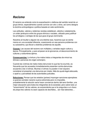 El documento trata sobre la homosexualidad. Define la homosexualidad como la atracción sexual, afectiva y emocional hacia personas del mismo sexo. Explica que el término "gay" se usa para referirse a hombres homosexuales y "lesbiana" para mujeres homosexuales. Menciona algunas posibles causas de la homosexualidad como la herencia, la genética y el abuso infantil. También describe algunas consecuencias como la discriminación, falta de trabajo y educación, y baja autoestima. Ofrece soluciones como recurrir a la fe, sacramentos y programas de