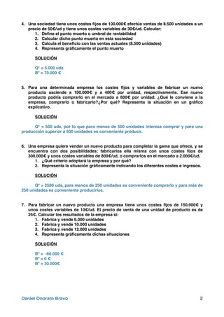Este documento presenta una serie de problemas relacionados con el umbral de rentabilidad o punto muerto de diferentes empresas. Incluye cálculos del punto muerto, costes variables y fijos, beneficios y representaciones gráficas para ilustrar diferentes situaciones financieras de las empresas.