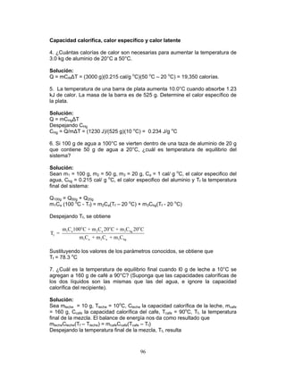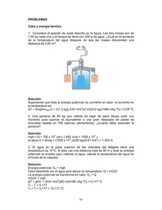1. El documento presenta una serie de problemas de física relacionados con conceptos de calor y energía térmica como capacidad calorífica, calor específico, calor latente, equilibrio térmico y conversión de energía. Los problemas incluyen cálculos de aumento de temperatura, temperatura final de sistemas térmicos, cantidad de calor requerida y cantidad de hielo fundido o agua evaporada.