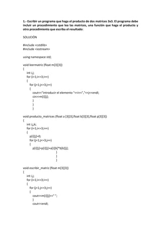 Este documento contiene 13 problemas resueltos de programación en C++. Cada problema presenta una breve descripción del problema y la solución implementada en C++ con funciones y procedimientos. Los problemas incluyen hacer el producto de matrices, calcular el perímetro de un triángulo, implementar una serie de Taylor, convertir números entre bases y verificar si un triángulo es posible.