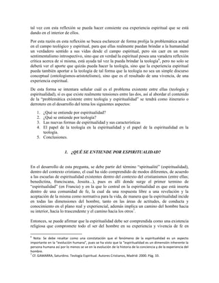 El documento reflexiona sobre la relación entre teología y espiritualidad en un contexto contemporáneo, marcado por el avance técnico-científico y un creciente individualismo que contrasta con la búsqueda de lo trascendental. Se analiza cómo, a pesar de la secularización, existe una necesidad espiritual profunda en el ser humano, y se critica la proliferación de espiritualidades superficiales en la actualidad. La teología puede ofrecer una perspectiva crítica que complemente la espiritualidad, buscando un sentido auténtico de la vida sin caer en el sentimentalismo.