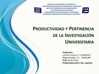 La investigación universitaria es fundamental para el desarrollo de los países y reconocida a nivel mundial por generar nuevo conocimiento y tecnología. La investigación y la docencia deben estar unidas para que los profesores puedan transmitir sus inquietudes intelectuales a los estudiantes y acercarlos a la realidad nacional. Las universidades venezolanas cuentan con vicerrectorados, revistas arbitradas, y programas de estímulo para fomentar la investigación de manera libre, imparcial y con pertinencia social.