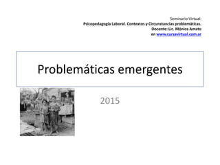 El documento trata sobre problemáticas emergentes en el contexto de la psicopedagogía laboral. Discuten temas como los desafíos que enfrentan los psicopedagogos ante problemas impredecibles, la necesidad de abordar múltiples dimensiones de manera interdisciplinaria, y la declaración de la UNESCO sobre la educación superior y la eliminación de problemas sociales. También define conceptos como vulnerabilidad, desarrollo sustentable y responsabilidad social.