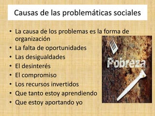 Las problemáticas sociales actuales incluyen la drogadicción, prostitución, violencia y pobreza, cuya causa radica en la organización social, desigualdades y falta de oportunidades. Estas cuestiones son cruciales para el desarrollo de una conciencia social y el pensamiento crítico frente a las realidades del Ecuador. La lucha de clases entre pobres y ricos resalta la necesidad de soluciones que aborden los intereses y conflictos existentes en la sociedad.