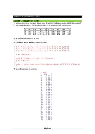 Este documento presenta un experimento con tres tratamientos (pasto solo, pasto más concentrados, pasto más concentrados y minerales) para evaluar su efecto sobre el rendimiento de lana en ovejas. Se proporcionan los datos de rendimiento de lana de dos esquilados para cada tratamiento. El documento analiza los datos mediante ANOVA de un factor para determinar si existe un efecto significativo del tratamiento y estimar las diferencias entre medias de rendimiento.