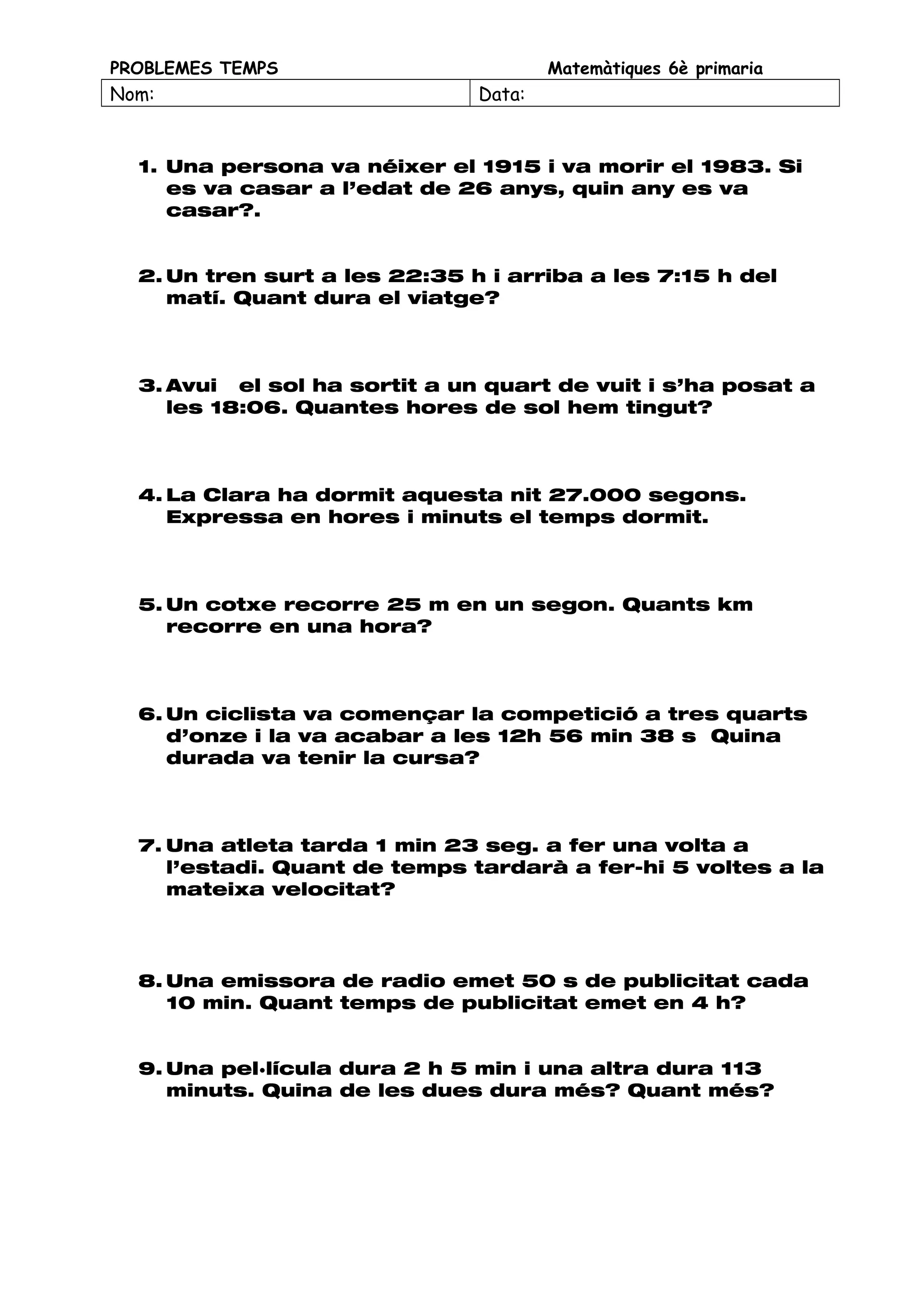 PROBLEMES TEMPS Matemàtiques6è primaria