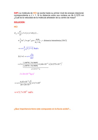 Este documento presenta la solución a un problema sobre la transición rotacional de la molécula de CO al absorber un fotón. Se calcula el momento de inercia de la molécula como 1,46×10−46 kg m2. También se pregunta sobre la importancia de este compuesto en el calentamiento global y el efecto invernadero.