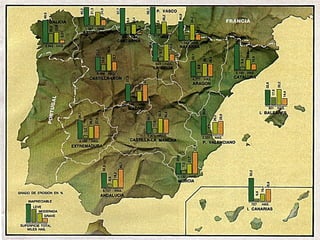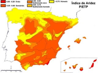 Este documento describe la problemática del agua a nivel mundial y en España. Explica que la escasez de agua tiene graves repercusiones sociales y que España sufre mayor escasez que la mayoría de países europeos. También analiza los niveles actuales de uso del agua en sectores como el doméstico, industrial y agrícola, así como los problemas de desertización y erosión del suelo relacionados con la gestión del agua.