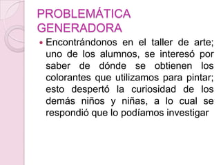 Los niños observaron los diferentes tipos de pinturas en el salón de clases y se preguntaron acerca del origen de los colorantes. Realizaron investigaciones apoyados por sus padres para explorar cómo obtener colorantes de frutas y verduras mediante experimentos. Interpretaron los resultados al comprobar que el betabel y las espinacas producen color rojo y verde, respectivamente. Comunicaron sus hallazgos a través de dibujos y conversaciones.