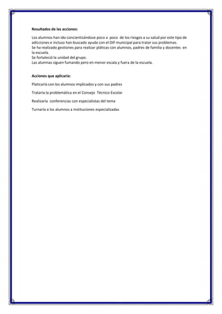Dos estudiantes femeninas de 13 y 14 años, Emily y Lizbeth, tienen problemas con el consumo de alcohol y tabaco, fumando dentro y fuera de la escuela. Viven con familiares debido a que sus padres están en Estados Unidos y tienen una situación económica baja. Esto ha generado adicciones a estas drogas legales entre los estudiantes del grupo, aunque se han ido concientizando de los riesgos. El maestro ha hablado con los estudiantes y padres, aplicado sanciones y realizado conferencias para abordar la