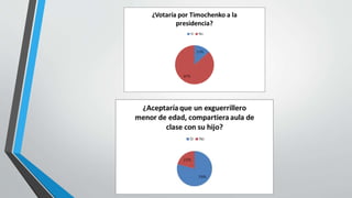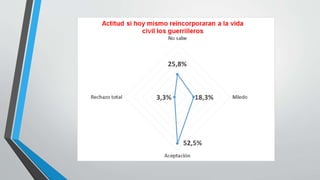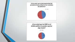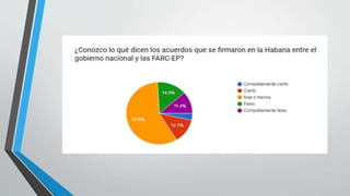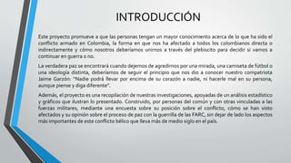 Este proyecto investigativo buscó dar a conocer el conflicto con las Farc en Colombia, una guerra que ha durado más de medio siglo y ha afectado a todos los colombianos, especialmente a los campesinos. Recopilaron opiniones sobre el plebiscito del 2 de octubre donde se votó en contra de los acuerdos de paz con las Farc. Incluyeron gráficas de encuestas que muestran las divisiones en la población sobre este tema.