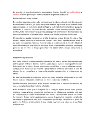El documento describe las problemáticas y logros de una experiencia docente reciente. Entre las principales problemáticas se encuentran la falta de disciplina de los estudiantes, quienes están acostumbrados a la indisciplina en el hogar, y la falta de valores como el respeto. Otras dificultades incluyen que los estudiantes a menudo no traían los libros o materiales necesarios a clase y no realizaban las tareas. El maestro implementó estrategias como anotar a los estudiantes que no cumplían para informar a los padres.