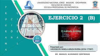 Este documento presenta la resolución de un problema de programación lineal mediante el método simplex. El objetivo es maximizar la función Z = 8x1 + 6x2 + 3x3 - 2x4 sujeto a cuatro restricciones. Se aplican los pasos del método simplex para convertir el problema a forma canónica y resolverlo iterativamente hasta encontrar la solución óptima.