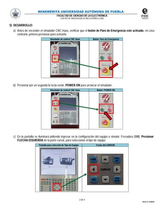 Este documento presenta los pasos para ejecutar un programa de calentamiento de husillo en un simulador de fresadora CNC Haas. Los pasos incluyen encender el simulador, seleccionar el tipo de equipo, eliminar alarmas, iniciar los servos, realizar el referenciado de ejes, acceder al programa de calentamiento guardado, ejecutar el programa y apagar correctamente el simulador.