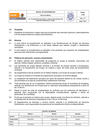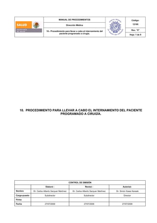 El documento describe el procedimiento para internar a pacientes programados para cirugía. El procedimiento consta de 12 etapas que involucran a la Dirección Médica, Subdirección de Cirugía, Subdirección de Servicios Ambulatorios y Subdirección de Enfermería. El procedimiento comienza con la valoración y programación del paciente para cirugía por parte de la Dirección Médica y termina con la realización de la intervención quirúrgica.
