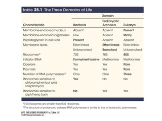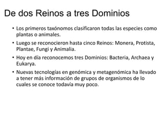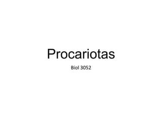 El documento resume la taxonomía y características de los procariotas. Explica que originalmente se reconocieron dos reinos, pero ahora se clasifican en tres dominios: Bacteria, Archaea y Eukarya. Los procariotas se encuentran en los dominios Bacteria y Archaea y carecen de núcleo y orgánulos. Algunos grupos importantes de procariotas son las cianobacterias, proteobacterias, firmicutes y actinobacterias. Los procariotas desempeñan un papel clave en los ciclos biogeoquímicos y en