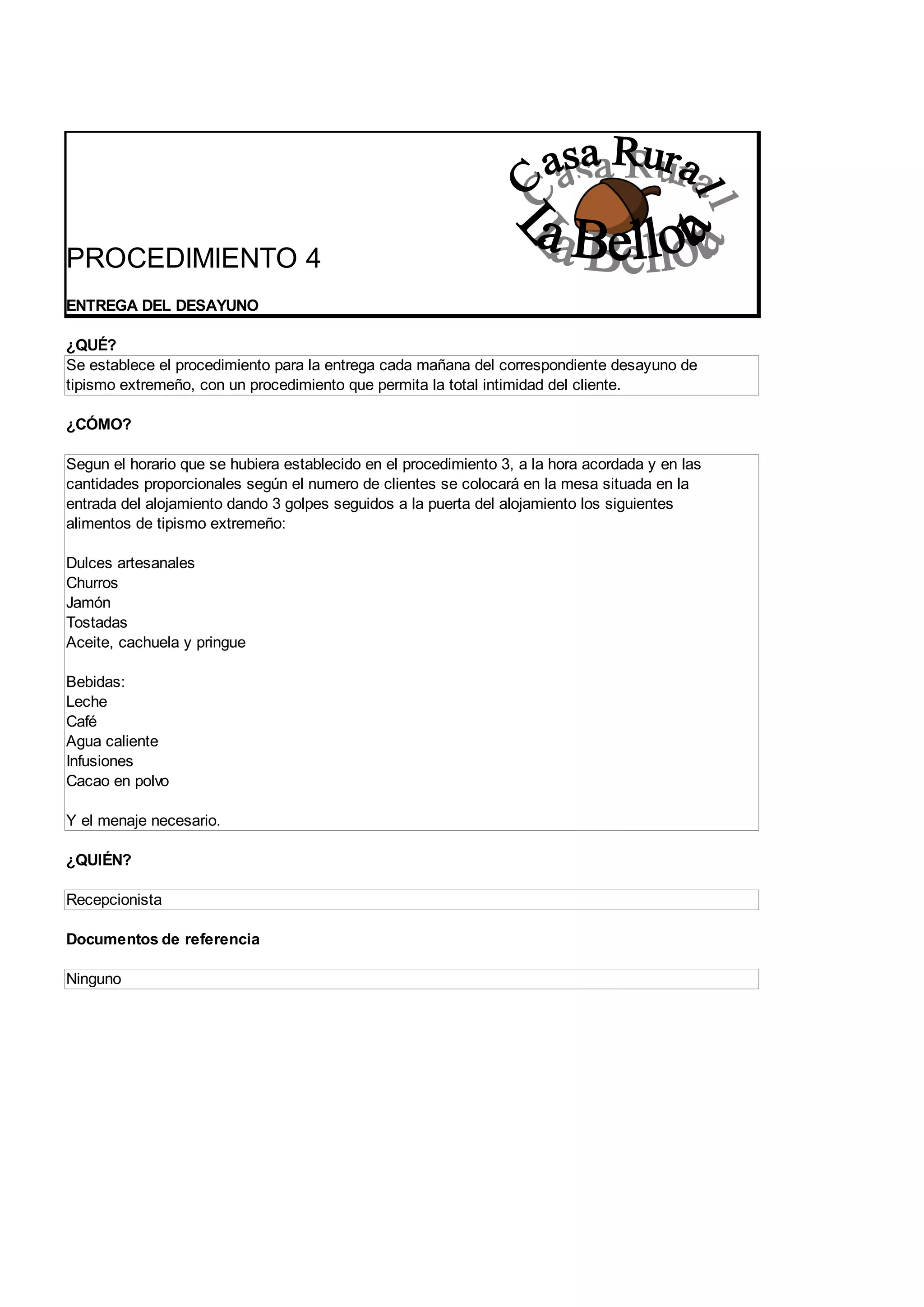 El procedimiento 4 establece que el recepcionista entregará el desayuno de tipismo extremeño en la mesa de la entrada del alojamiento a la hora acordada, incluyendo dulces, churros, jamón, tostadas, aceite, cachuela y pringue, así como leche, café, agua caliente, infusiones y cacao en polvo, para garantizar la intimidad de los clientes.