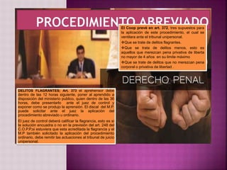 El documento detalla el procedimiento para la detención y presentación de acusados en casos de delitos flagrantes y menos graves, estableciendo plazos específicos para la actuación del ministerio público y el juez de control. Describe las condiciones bajo las cuales se puede aplicar el procedimiento abreviado y las consecuencias si no se determina flagrancia. Asimismo, se define la estructura del juicio ante un tribunal unipersonal dependiendo del tipo de delito y los plazos de respuesta requeridos.