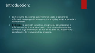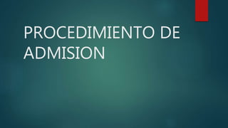 El procedimiento de admisión incluye recibir al paciente y su familia, proporcionar información sobre los trámites y normas del establecimiento, y realizar un examen físico que incluye medir el peso, la temperatura y otros signos vitales para evaluar el estado del paciente. Las notas de enfermería son importantes para registrar los cambios en el paciente, los cuidados brindados y colaborar con el diagnóstico médico.