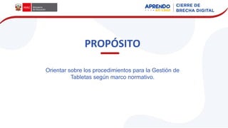 Este documento describe los procedimientos para la entrega y gestión de tabletas como parte de la estrategia "Aprendo en Casa" del Ministerio de Educación de Perú. Explica cómo las tabletas serán distribuidas a las escuelas, recibidas, almacenadas temporalmente y entregadas a los estudiantes y docentes. También cubre temas como el registro de usuarios, el manejo de excedentes, y el retorno y cuidado de las tabletas. El objetivo es garantizar que los estudiantes tengan acceso a recursos educativos digitales