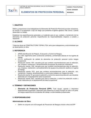 Este documento establece las especificaciones y responsabilidades para el uso adecuado de los elementos de protección personal en las obras de Constructora Topan Ltda. Define los elementos de protección básicos requeridos como casco, lentes, calzado de seguridad y chaleco reflectante, así como otros elementos adicionales según los riesgos específicos. Asigna roles como al Administrador, Encargado de Prevención de Riesgos y Supervisores para garantizar la entrega, uso, mantención e inspección correcta de los elementos de protección personal