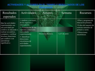 El documento describe un plan de actividades y actores involucrados en un proyecto de educación primaria sobre ciencias naturales durante junio. Las actividades incluyen el análisis y formulación de aspectos a intervenir, identificar direcciones electrónicas de experimentos, analizar factores sociales, económicos y ambientales, realizar experimentos por grados escolares, expresar comentarios por escrito, intercambiar opiniones, y evaluar las actividades. Los actores son docentes, alumnos, padres de familia y un experto. Los resultados esperados son reconoc