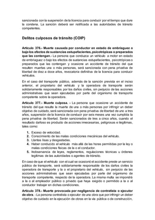 Este documento describe las leyes y regulaciones de tránsito en Ecuador, incluyendo infracciones, delitos y contravenciones. Define infracciones de tránsito como acciones u omisiones culposas en el transporte y seguridad vial. Detalla las sanciones para diferentes tipos de infracciones que involucren lesiones o muerte, así como para conducir bajo la influencia de alcohol u otras drogas. También cubre temas como exceso de velocidad, transporte público sin licencia, y daños mecánicos previsibles que pongan en pelig