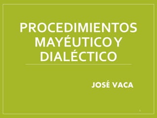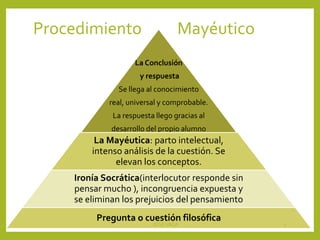 Este documento describe los procedimientos mayéutico y dialéctico. El procedimiento mayéutico implica hacer preguntas socráticas para eliminar los prejuicios del pensamiento del interlocutor y llegar a una conclusión real a través del desarrollo intelectual del alumno. El procedimiento dialéctico involucra establecer una hipótesis, deducir conclusiones usando lógica y razonamiento, y comprobar la hipótesis para evolucionar el conocimiento.