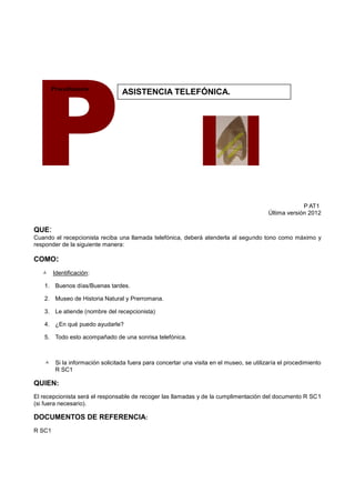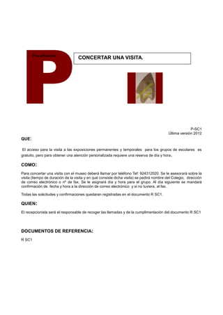 El documento describe los procedimientos para concertar una visita escolar al museo, incluyendo llamar para reservar un día y hora, recibir una confirmación por correo electrónico, y registrar la solicitud. También cubre los procedimientos para atender llamadas telefónicas de manera amable y profesional.