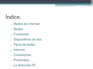 Este documento resume los conceptos clave de las redes de internet. Explica que las redes se agrupan para formar Internet y cubre temas como los tipos de redes (cableadas e inalámbricas), los dispositivos de red comunes, y los protocolos y direcciones clave como IP y MAC. También brinda una guía de los pasos para instalar una red básica.