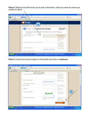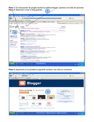 Este documento proporciona 10 pasos para crear un blog gratuito en Blogger.com, incluyendo buscar "blogger" en Google, hacer clic en "crear tu blog gratuito", completar un formulario con información de cuenta y detalles del blog, seleccionar una plantilla, y hacer clic en "empezar a publicar" para comenzar a usar el nuevo blog.