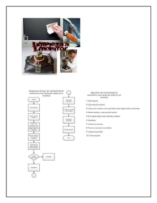 Este documento proporciona instrucciones para realizar el mantenimiento de varios componentes de una computadora, incluyendo el teclado, monitor, mouse, disco duro y fuente de alimentación. Describe los pasos para limpiar y revisar estos componentes para garantizar que funcionen correctamente y prevenir fallas futuras. También recomienda verificar periódicamente el espacio libre en el disco duro y eliminar archivos temporales para mejorar el rendimiento.