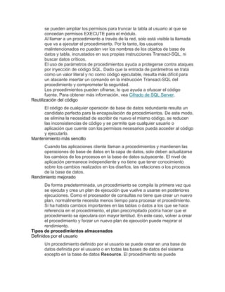 Este documento describe los procedimientos almacenados en SQL Server. Los procedimientos almacenados permiten agrupar instrucciones SQL y proporcionan varias ventajas como mayor seguridad, reutilización de código, mantenimiento más sencillo y mejor rendimiento. Existen diferentes tipos de procedimientos como los definidos por el usuario, temporales y del sistema.
