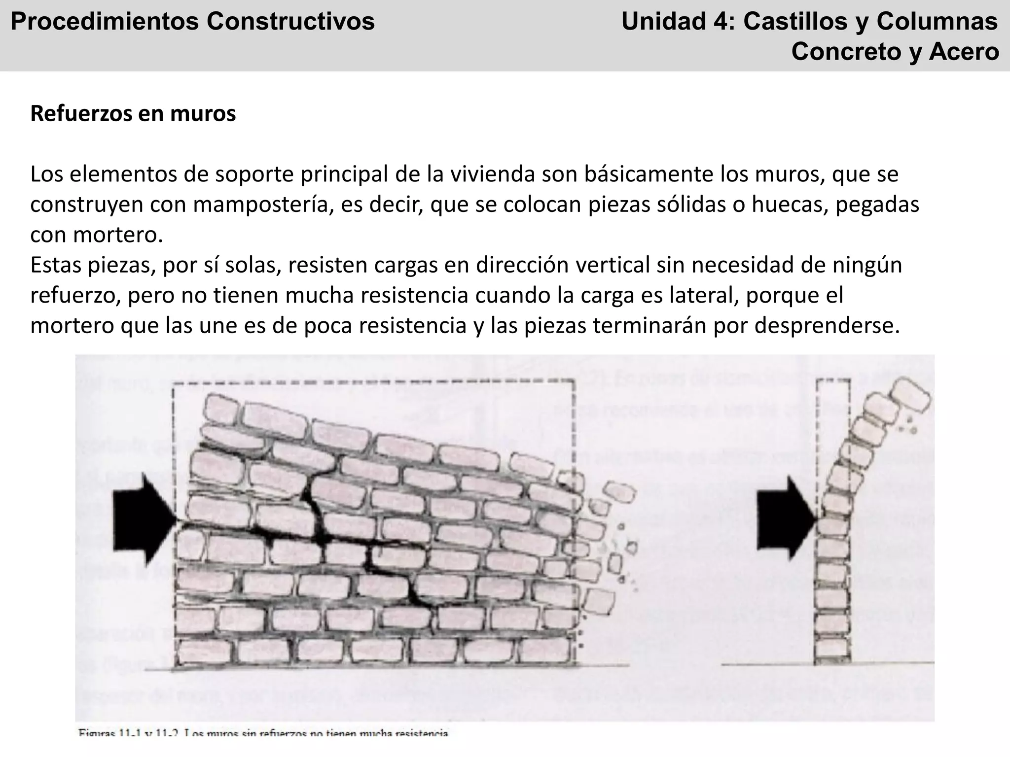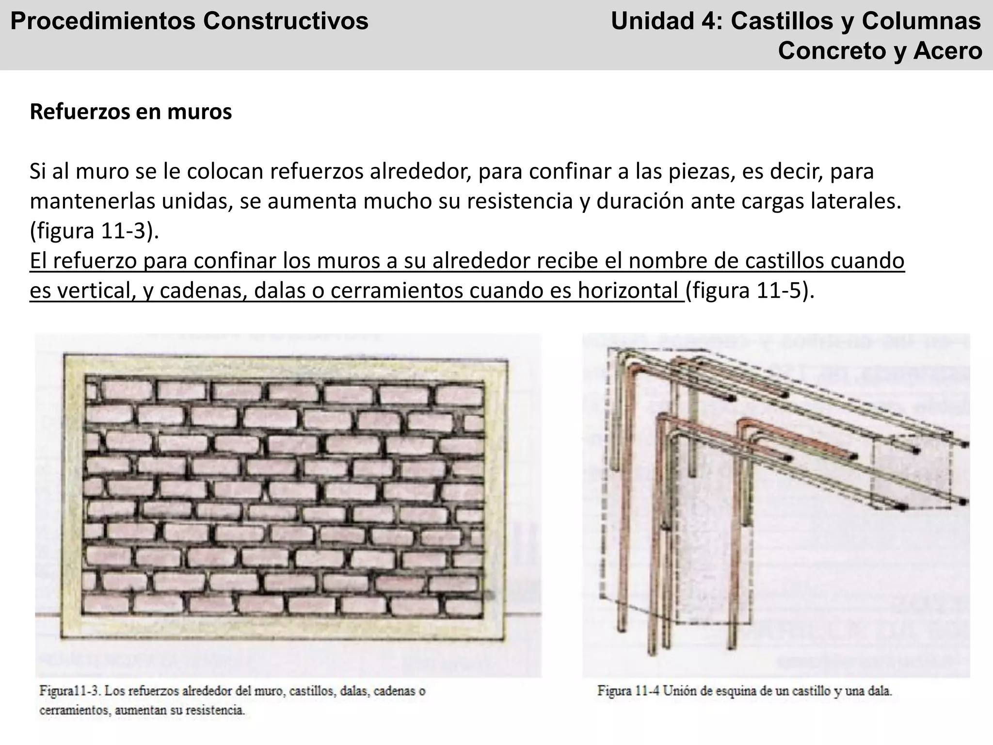 El documento describe los procedimientos de construcción de castillos y columnas. Los castillos son elementos verticales de refuerzo que aumentan la resistencia de los muros de mampostería. Las columnas son elementos estructurales verticales que soportan la carga de la edificación. Se detallan los materiales, dimensiones y procedimientos para construir castillos de concreto ahogados en los muros y columnas de concreto armado.