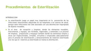 Este documento describe los procedimientos de esterilización en un centro de salud. Explica que la esterilización es importante para prevenir infecciones, y describe los pasos de limpieza, desinfección y esterilización que incluyen limpiar instrumentos, usar desinfectantes adecuados como el glutaraldehído, empaquetar e inspeccionar equipos antes de almacenarlos de forma estéril. También cubre la importancia de la bioseguridad para el personal a través del uso de equipo de protección como guantes