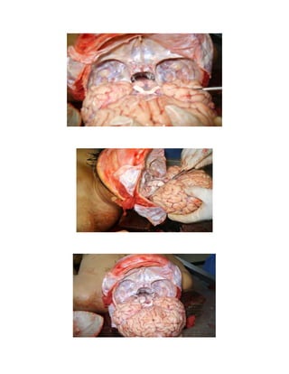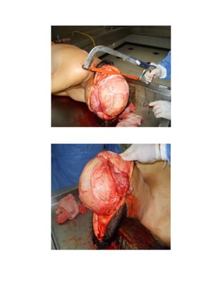 Este documento presenta los procedimientos y técnicas de una autopsia médico-legal, incluyendo la exploración externa e interna del cadáver, el examen de órganos y cavidades, y el dictamen final. Describe el orden sistemático de la autopsia, como la apertura del cráneo, tórax, abdomen y extremidades, asi como el examen e identificación de lesiones o causas de muerte. El objetivo es investigar cualquier lesión que pudo haber producido el deceso de manera completa pero eficiente.