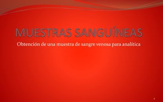 El documento describe los pasos para obtener una muestra de sangre venosa para análisis. Explica cómo seleccionar la vena adecuada, desinfectar la piel, insertar la aguja en la vena usando el método de jeringa o sistema de vacío, llenar los tubos necesarios, aplicar presión después de retirar la aguja, y enviar las muestras al laboratorio. El objetivo es obtener la cantidad suficiente de sangre para las pruebas de laboratorio solicitadas de manera aséptica y con el cuidado adec