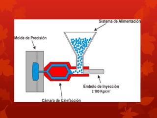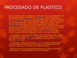 El documento describe varios procesos de procesamiento de plásticos, incluyendo moldeo por inyección, extrusión, soplado, prensado, hilado, laminado y moldeo al vacío. Explica cómo cada proceso transforma las resinas básicas en productos plásticos terminados mediante la aplicación de calor, presión y otros componentes químicos.