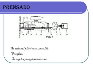 El documento describe cinco procesos principales para procesar plásticos: prensado, extrusión, inyección, soplado y laminación. Cada proceso calienta y moldea el plástico de diferentes maneras para producir objetos como piezas huecas, planchas, tuberías, recipientes, botellas y fundas. El documento concluye que aunque algunos plásticos son reutilizables mediante reciclaje, otros no lo son, y que los plásticos son materiales baratos, ligeros y versátiles.