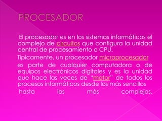 El documento habla sobre los procesadores de computadoras. Explica que el procesador es la unidad central de procesamiento o CPU que hace los procesos informáticos. Luego lista diferentes modelos de procesadores de marcas como Intel, AMD, Cyrix ordenados cronológicamente por año de lanzamiento. Finalmente indica que los procesadores actuales se miden por su velocidad en gigahertz en lugar de megahertz y menciona a Intel y AMD como las marcas más conocidas.