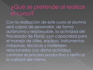 Este curso capacitará a los estudiantes para desarrollar de forma autónoma y responsable la actividad de procesado de fibras. Los estudiantes aprenderán a identificar y clasificar fibras textiles, contar hilos, y utilizar técnicas y maquinaria para procesar fibras y producir hilados. También se introducirán conceptos básicos de informática.