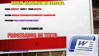 El documento describe las funciones y características de los procesadores de texto. Explica que los procesadores de texto permiten crear, editar y formatear documentos de manera más versátil que las máquinas de escribir antiguas. Entre las funciones se encuentran la capacidad de aplicar formatos de texto, insertar imágenes, guardar y imprimir documentos, numerar páginas, notas al pie, y crear tablas de contenido e índices. Ejemplos comunes de procesadores de texto son Microsoft Word y OpenOffice Writer.