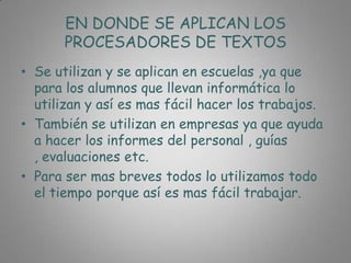 Este documento describe las ventajas y desventajas de los procesadores de texto, cómo se aplican en diferentes entornos como escuelas y empresas, y algunos de los procesadores de texto más conocidos como Microsoft Word, Lotus Word Pro y WordPerfect. También detalla los elementos básicos que componen un procesador de texto y cómo crear, guardar, imprimir y obtener ayuda en uno.