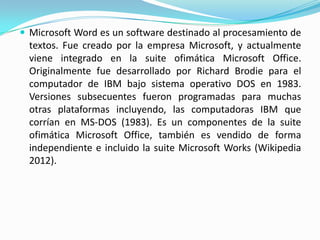 El documento habla sobre los procesadores de texto y Microsoft Word. Explica que Microsoft Word es un software creado por Microsoft para procesar textos de manera sencilla y rápida. Originalmente fue desarrollado por Richard Brodie para IBM en 1983 y ahora es parte integral de Microsoft Office, aunque también se vende de forma independiente. Menciona algunos otros procesadores de texto populares como Lotus Word Pro, WordPerfect y WordPad.