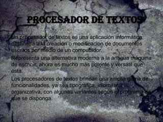 Un procesador de textos es una aplicación informática destinada a la creación y modificación de documentos escritos por medio de un computador. Representa una alternativa moderna a la antigua máquina de escribir, ahora es mucho más potente y versátil que ésta. Los procesadores de textos brindan una amplia gama de funcionalidades como formato, idioma y organización, con variantes según el programa.