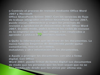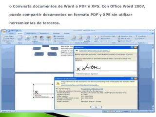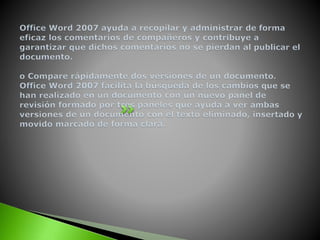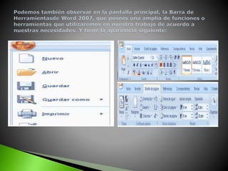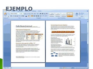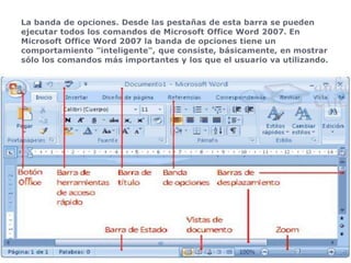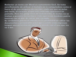 Word es el procesador de texto de Microsoft Office. Permite crear documentos y aplicar formatos de fuentes, estilos de párrafo, encabezados y pies de página. Incluye una herramienta de corrección ortográfica y gramatical que facilita la creación y edición de documentos.